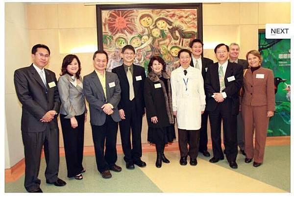 ▲印尼駐台代表蘇哈鐸諾(左一)、NU SKIN台灣分公司總裁姜惠琳(左二)、台大醫院副院長何弘能(左四)、匈牙利駐台代表賴斯祿夫婦(右一與右二)等,於台大兒醫大廳主要畫作「幸福腳踏車」前留影。