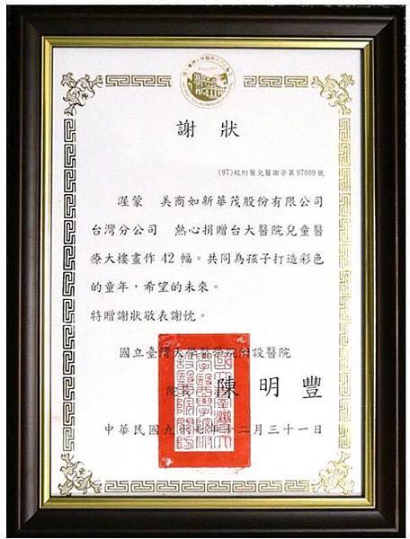▲台大醫院致贈NU SKIN感謝狀。