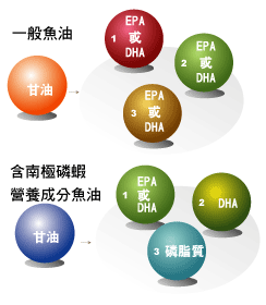 如之前所提及,南極磷蝦含有豐富的DHA及EPA。但不同於一般深海魚油之處,除了南極磷蝦油有獨特磷脂質成分外,在南極磷蝦油脂中,其DHA成分的特殊結構,在其消化過程中,故DHA被人體吸收,在人體吸收運用上,尤其是對腦及細胞膜更具效率。