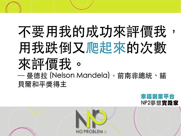 不要用我的成功來評價我,用我跌倒又爬起來的次數來評價我。─ 曼德拉 (Nelson Mandela),前南非總統、諾貝爾和平獎得主 ʺDo not judge me by my successes, judge me by how many times I fell down and got back up again.ʺ