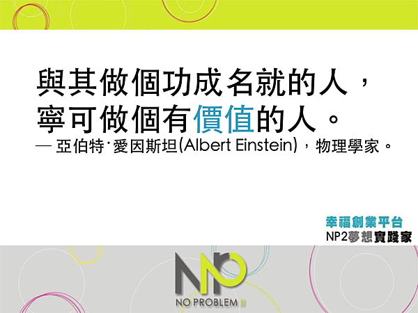 與其做個功成名就的人,寧可做個有價值的人。─ 亞伯特‧愛因斯坦(Albert Einstein),物理學家。 "Try not to become a man of success but rather try to become a man of value. ”