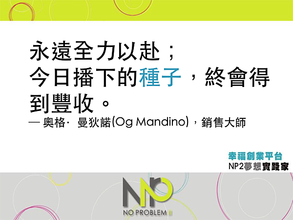 ── 奧格·曼狄諾(Og Mandino),銷售大師 Always do your best. What you plant now, you will harvest later.