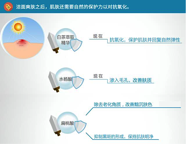 潔面爽膚之後,肌膚還需要自然的保護力以對抗氧化,保護肌膚不受環境影響惡化。如新®淨膚抗痘日間調理精華中蘊含: