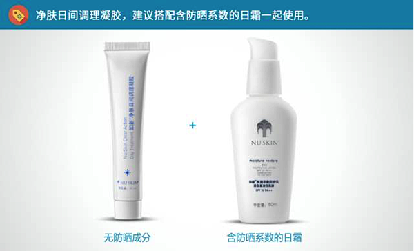 請注意:因為此款產品無防曬成分,而黯沉肌膚防曬非常重要,所以建議搭配含防曬係數的日霜,例如如新®水潤平衡防護乳SPF15 PA++,混合至油性。