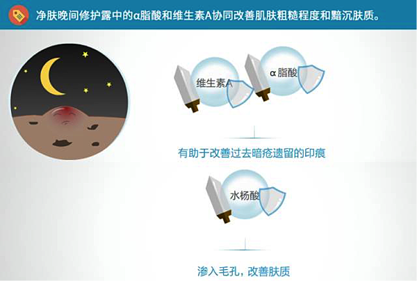 蘊含α脂酸的如新®淨膚抗痘夜間修護精華,能淨化肌膚,膚色不均、肌膚不平坦等問題。每一次使用都能提供更有效的修護調理效果,讓清晨醒來的您能擁有更光滑澄淨、膚色更勻質的健康肌膚。不過需要注意:此款產品有較強的滋養效能,不適合在暗瘡治療的初期使用,在修復痘疤期可以使用。
