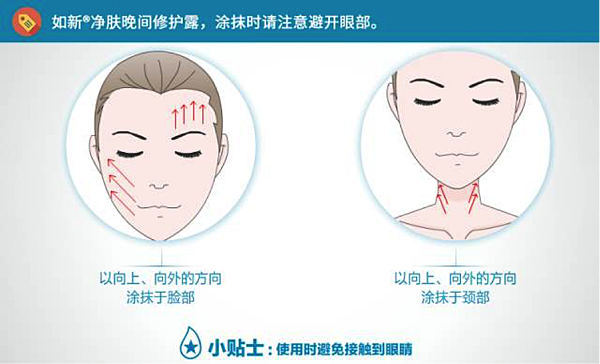 晚上於淨膚爽膚水後使用。取出適量的晚間修護露,以向上、向外的手法輕輕塗抹於臉部和頸部,塗抹時請注意避開眼部。