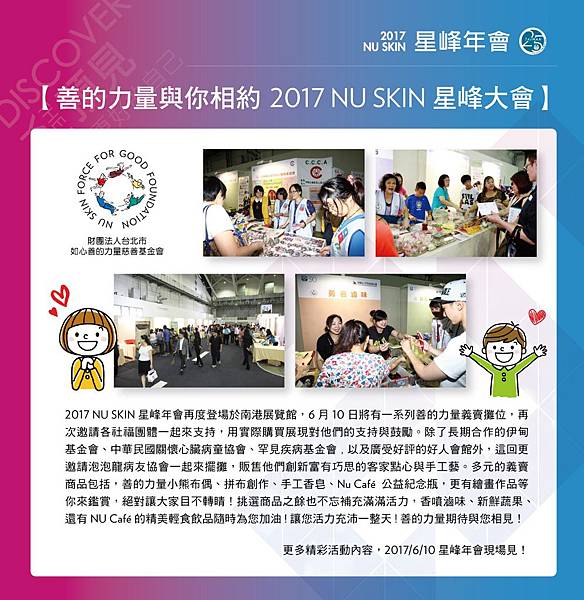 2017NU SKIN 星峰年會再度登場於南港展覧館,6月10日將有一系列善的力量義賣攤位,再次邀請各社福團體一起來支持,用實際購買展現對他們的支持與鼓勵。