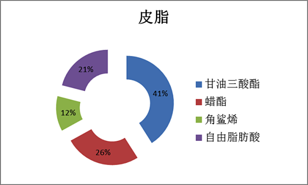 我們的皮脂腺分泌出皮脂,經過一些細菌打磨,構成一個比較穩定的比例,大概是甘油三酸酯(~ 41%)、蠟酯(~ 26%),角鯊烯(~ 12%),和自由脂肪酸。這些成分的成比例搭配,搭配出一個神奇的性質: