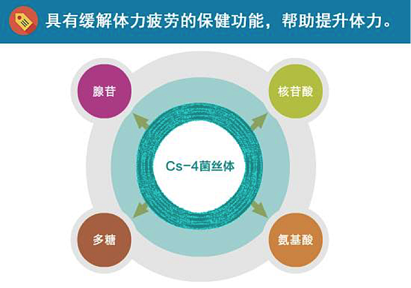 如新華茂蟲草精沛膠囊中的Cs-4富含多種腺苷和核苷酸、胺基酸、多糖等營養物質,具有緩解體力疲勞的保健功能,幫助提升體力。