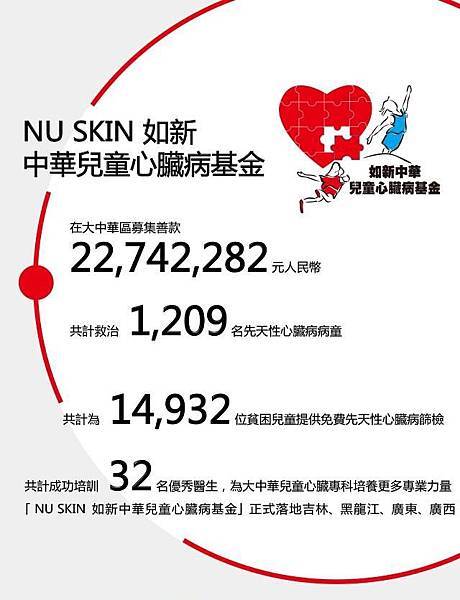 為了將社會的長期負擔轉化為未來貢獻的力量,賦予先心病患兒如新的生命,NU SKIN 於 2008年也在大中華區正式發起了「NU SKIN 如新中華兒童心臟病基金」慈善救助專案。