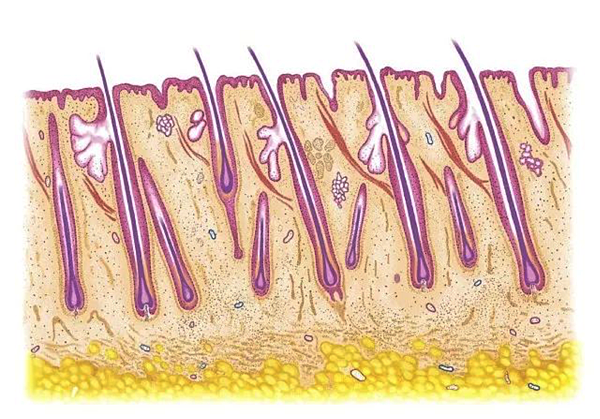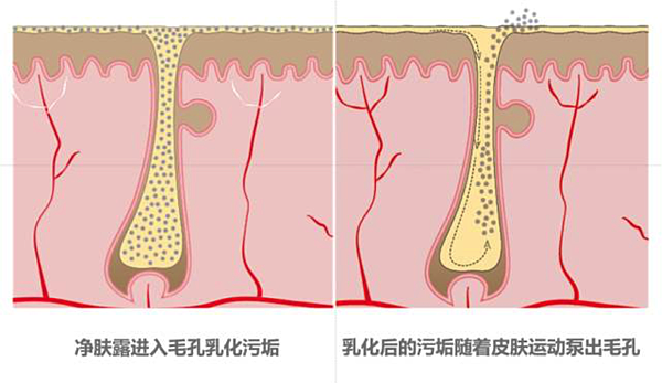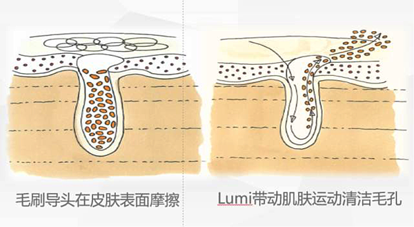 至於毛孔深處的垃圾,刷毛雖細,卻因為毛孔實際並非一個“坑”,而是一個細而深的“洞”,所以就算單根刷毛的粗細小於毛孔的直徑,毛刷整個平面在皮膚表面刷動的時候,單根的刷毛也無法進入毛孔深處去“掃除”垃圾。唯一真正有效的方法是先將毛孔中的垃圾乳化,變成半液體狀,然後通過皮膚橫向和縱向的一定頻率的運動來將已乳化的垃圾泵浦式抽壓出來,如下圖:
