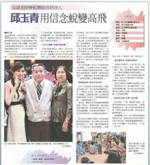 當邱玉青獲升任藍鑽石級直銷主任時,她哭成淚人兒。她永遠記得那一天升任新科藍鑽活動,從小到大忙到沒時間參加她活動的父母親,專程參加表揚活動、一同分享她的榮耀。