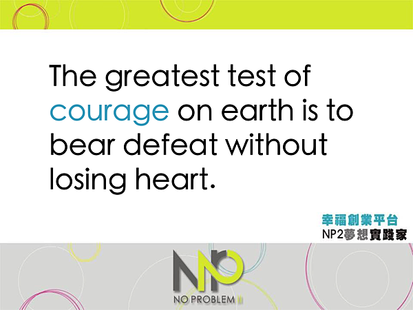 世界上對勇氣的最大考驗是忍受失敗而不喪失信心。 The greatest test of courage on earth is to bear defeat without losing heart.